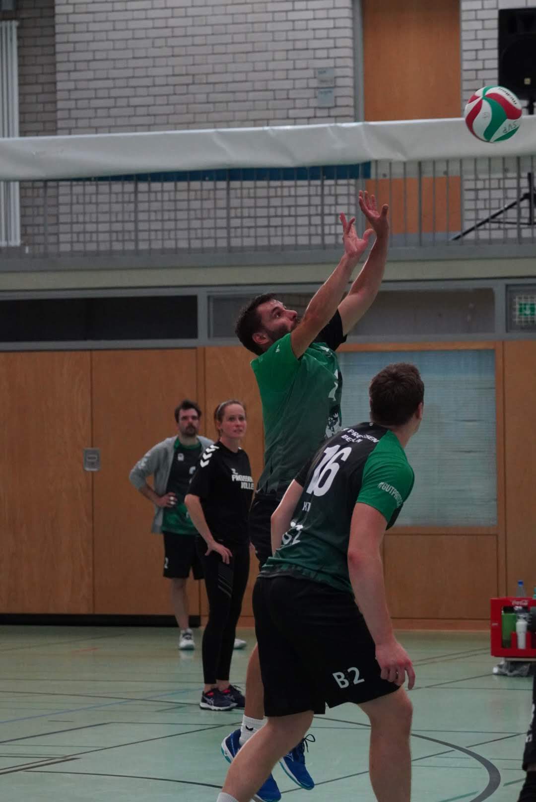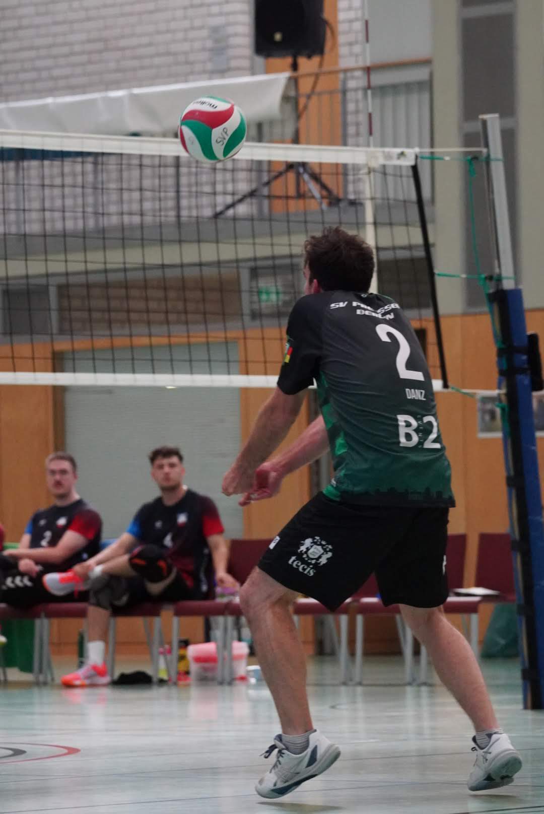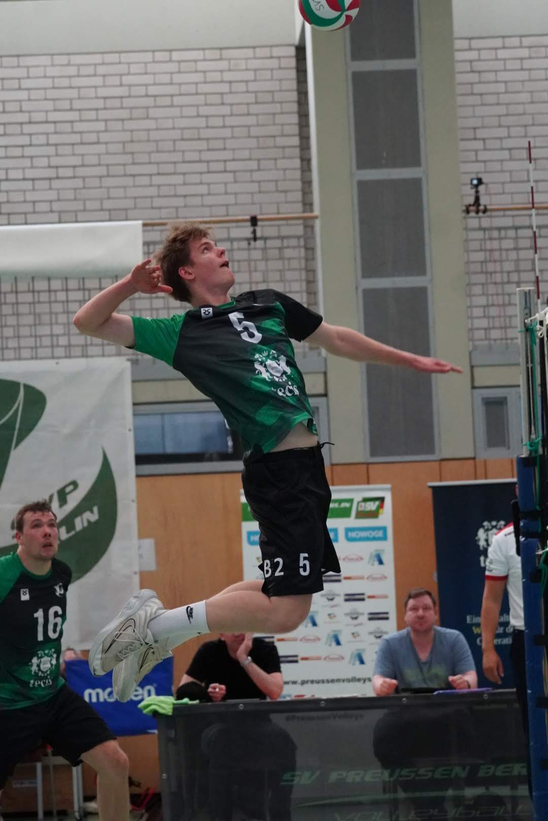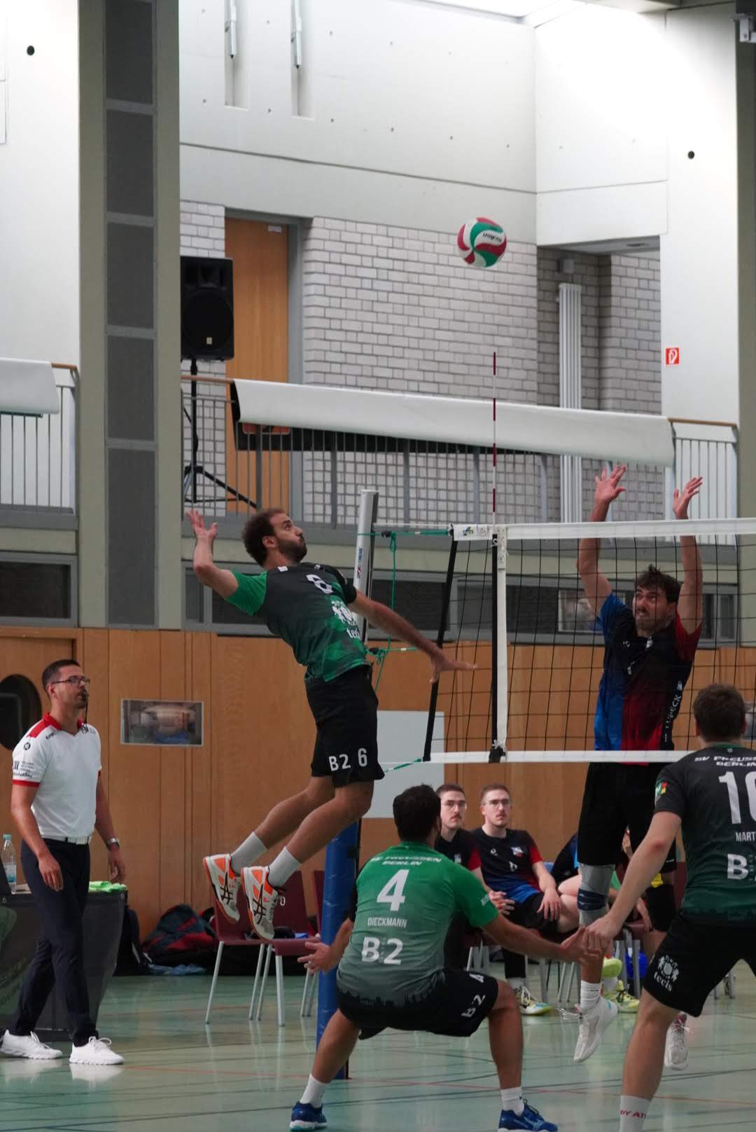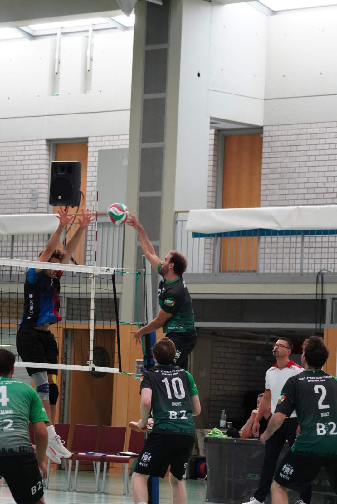 SV Preußen startete mit Kapitän Peter, Yanik, Otto, Dima, Omar und Robert² in den ersten Satz. Dieser gestaltete sich, wie zu erwarten, spannend und bis zum Stand von 10:10 konnte sich keines der Teams absetzen. Doch dann konnte der an diesem Tag stark aufschlagende Peter ein kleines Drei-Punkte-Polster für uns erarbeiten. Jedoch kämpfte sich Lübeck mit zwei kleinen Serien wieder heran und konnte zum 22:22 ausgleichen. Am Ende behielten wir trotz der warmen Halle einen kühlen Kopf und machten die entscheidenden drei Punkte zum 25:22.