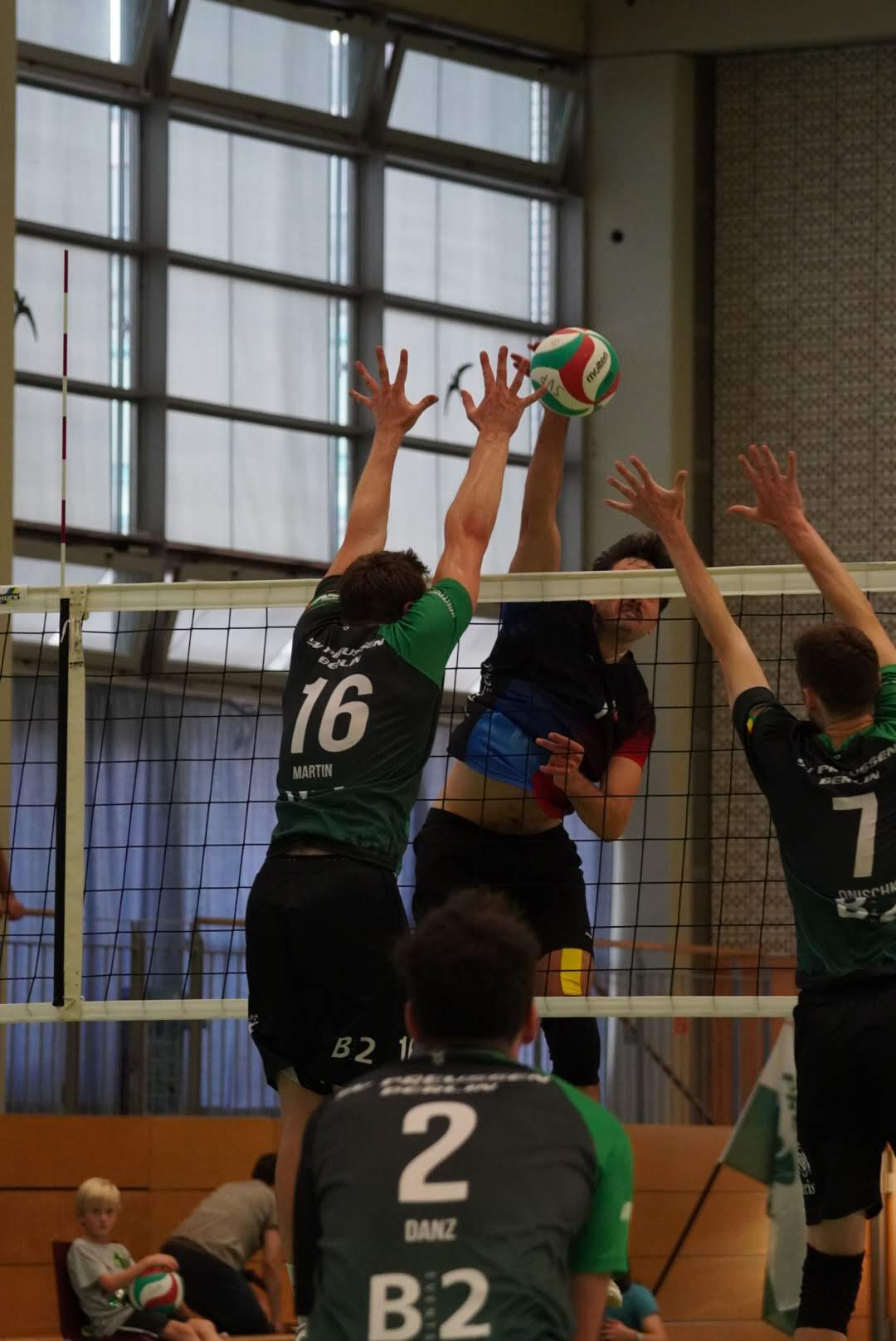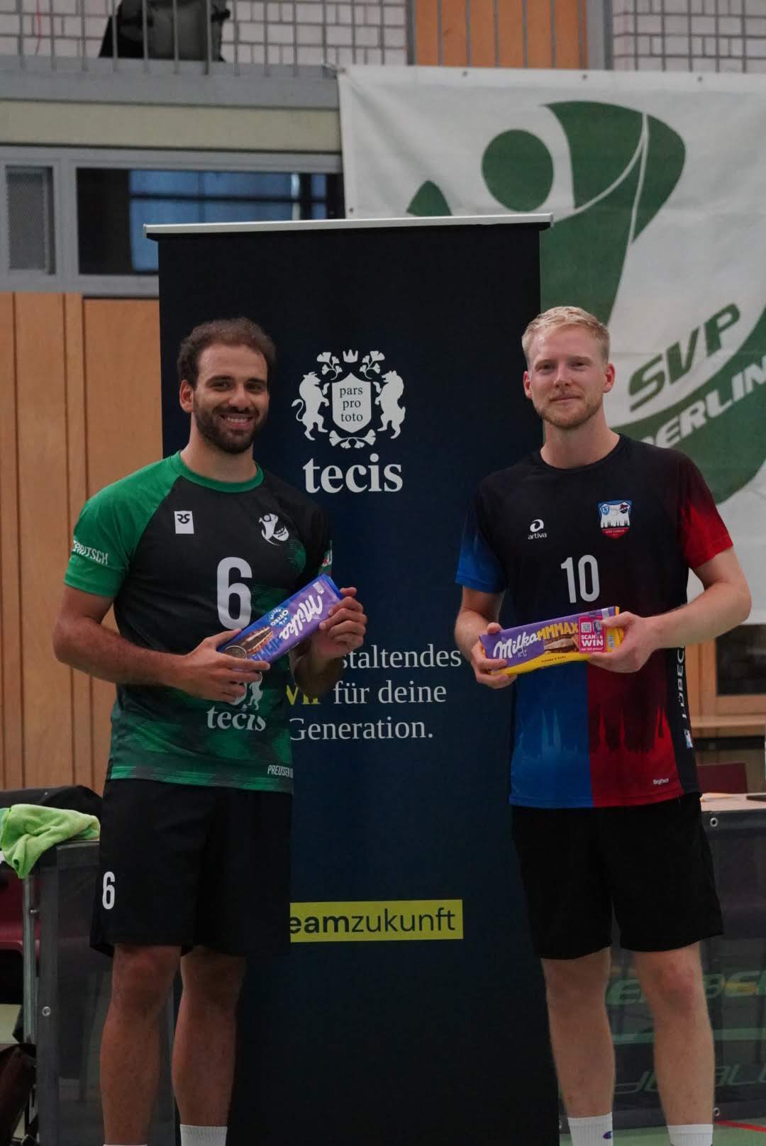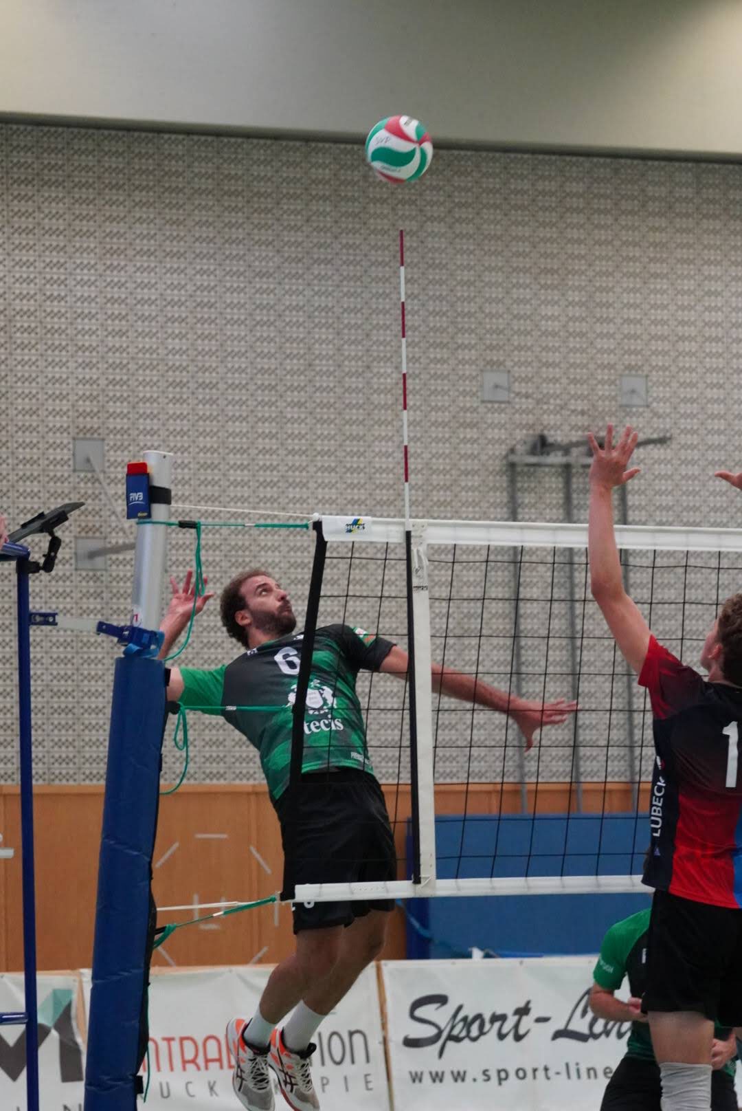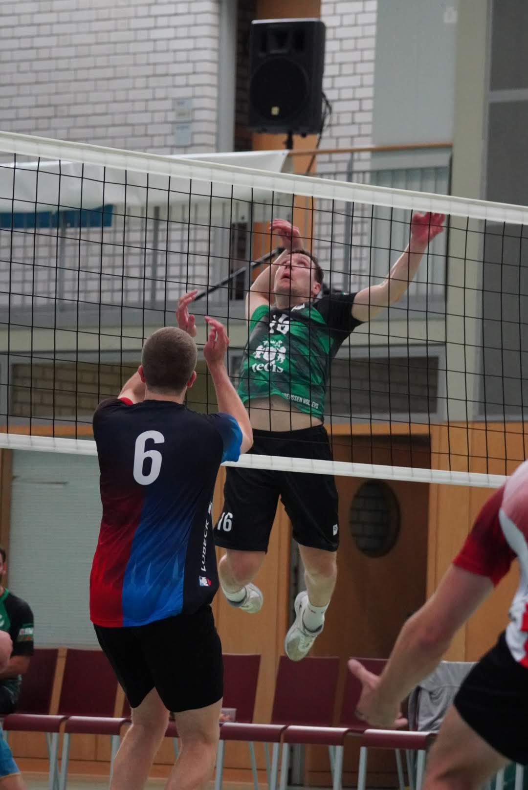 Ohne Wechsel auf unserer Seite starteten wir mit einem 0:3 Rückstand in den zweiten Satz. Der spätere MVP von Lübeck, Christoph Menge, zeigte uns hier wieder einmal, dass er sehr gut Aufschlagen kann und stellte uns wie schon im ersten Satz vor Probleme in der Annahme. Davon ließen wir uns aber nicht unterkriegen und mit einer starken Block-/Abwehrleistung schlossen wir die Lücke zügig zum 5:5. Ab hier entwickelte sich ein offener Schlagabtausch zwischen den beiden Teams bis zum 24:24. Doch wie auch schon in allen Testspielen zeigten wir am Samstag besonders in der Crunchtime Nervenstärke und holten uns auch den zweiten Satz mit 29:27.