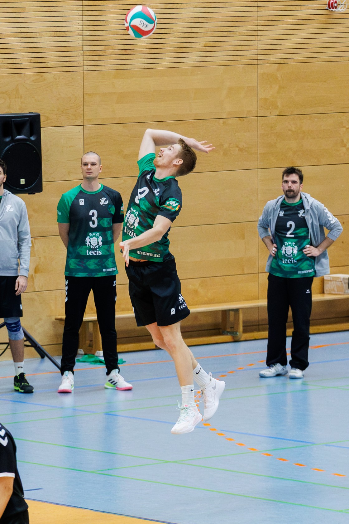 Auch der dritte Durchgang erinnerte stark an Satz zwei: Wenige Eigenfehler, viel Druck im Aufschlag und eine stabile Annahme sorgten dafür, dass wir den Satz über weite Strecken dominierten. Pinneberg fand zwar gegen Ende wieder etwas besser ins Spiel, doch der Vorsprung war zu groß. Mit 25:15 stellten wir auf 2:1 und nutzten die Gelegenheit, um im Hinblick auf einen langen Volleyballabend etwas durchzuwechseln.